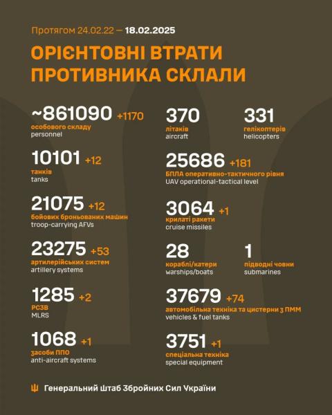 Втрати ворога на 18 лютого 2025 року / Інфографіка Генштабу ЗСУ