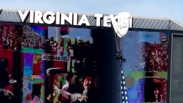 Це тому, що парашутист, який ніс прапор США, врізався в табло на стадіоні «Лейн» у Вірджинському політехнічному університеті та залишився висіти над екраном.
