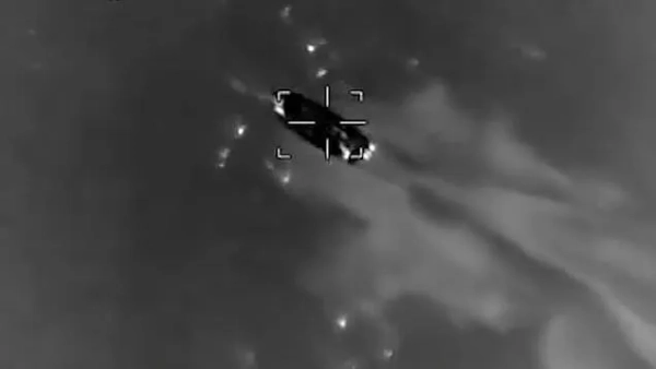 На відеозаписі удару видно, як човен спалахнув у воді після того, як у нього влучила, ймовірно, ракета.