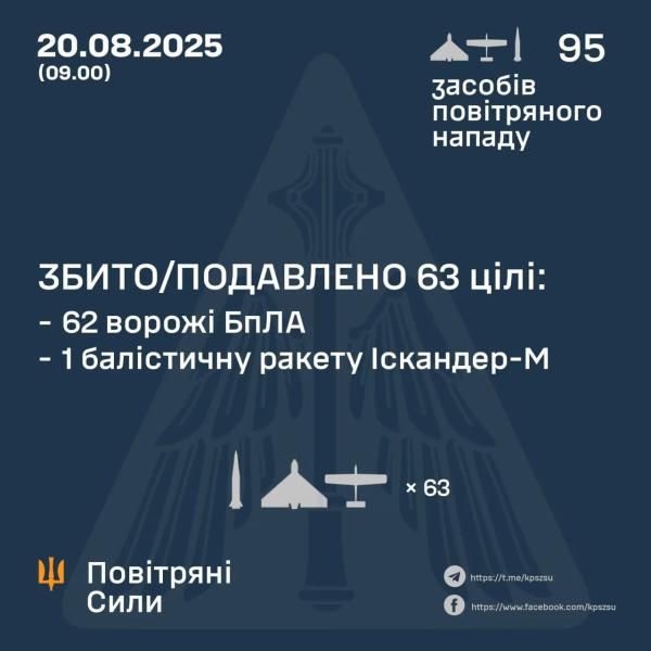 Станом на 9 годину ранку, силами ППО збито/подавлено балістичну ракету Іскандер-М та 62 ворожі БпЛА типу Shahed і дронів-імітаторів різних типів на півночі та сході країни.