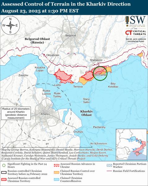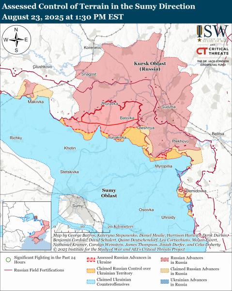 За даними ISW, на Сумщині окупанти продовжили наземні атаки на північний захід від міста Суми поблизу Степного, на північ від Сум біля Новокостянтинівки та Кіндратівки, а також на північний схід – поблизу Юнаківки та Варачиного 22 та 23 серпня. Втім, підтверджень успіху агресора немає.