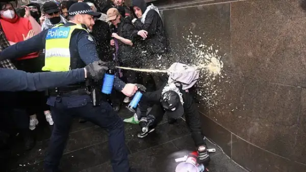 В Мельбурне протестующие столкнулись с участниками отдельного митинга в поддержку Палестины. Среди выступавших был известный в стране неонацист Томас Сьюэлл, обратившийся к толпе с лестницы здания парламента.