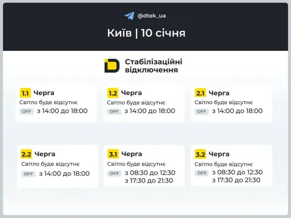 Графік відключення для Києва на 10 січня / Фото ДТЕК