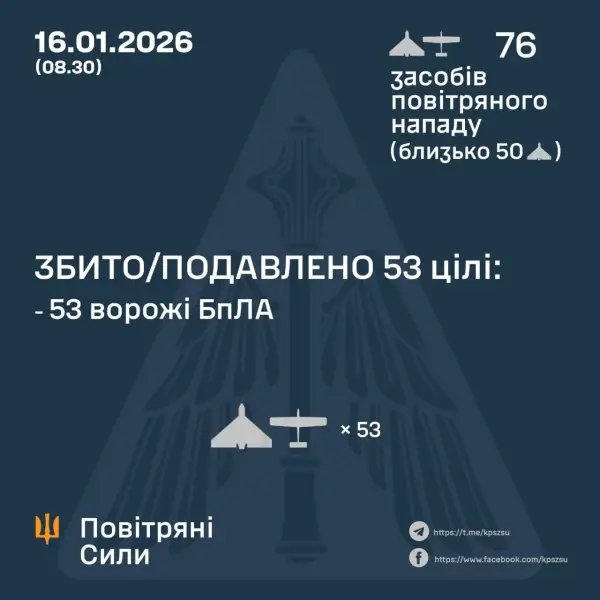 Згідно з попередньою інформацією, станом на 08:30 українська протиповітряна оборона знешкодила або знищила 53 ворожі дрони.