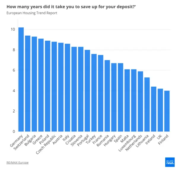 В середньому європейцю потрібно приблизно 7,3 року, щоб накопичити кошти на початковий внесок. У Німеччині цей показник може сягати 10 років.