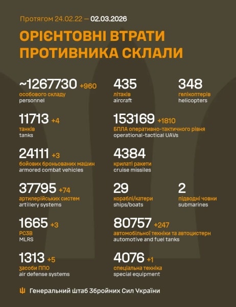 Ми зібрали для вас інформацію про тисяча чотириста шістдесят восьмий день Великої війни: чим жили Україна та українці 2 березня 2026 року.