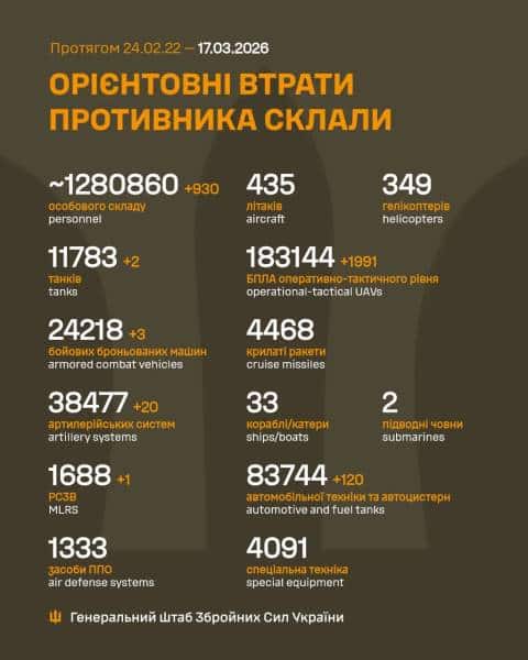 Ми зібрали для вас інформацію про тисяча чотириста вісімдесят третій день Великої війни: чим жили Україна та українці 17 березня 2026 року.