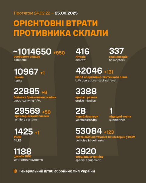 Ми зібрали для вас інформацію про тисяча двісті вісімнадцятий день Великої війни: чим жили Україна та українці 25 червня 2025 року.