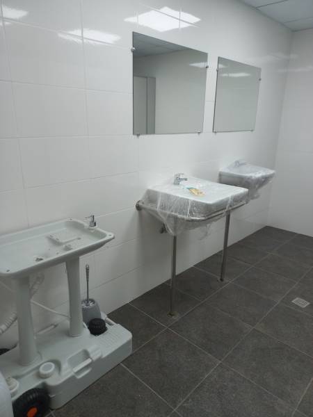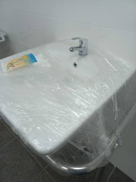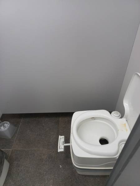 Санітарна зона з біотуалетами, але відсутня вода, поруч закриті плівкою непідключені стаціонарні раковини й автономний рукомийник із залишками води у ньому. Тож гидотний запах тут гарантований, і шириться далі, у всі приміщення.