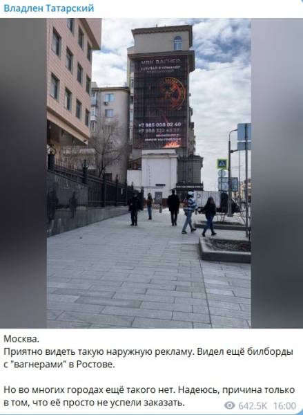 І наостанок про злочин і покарання. Останній персональний допис у житті «воєнкора» та інформаційного злочинця Владлена Татарського був присвячений тому, як йому «приємно бачити зовнішню рекламу «Вагнера».