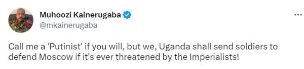 «Називайте мене «путіністом», якщо хочете, але ми, Уганда, пошлемо солдатів захищати москву, якщо їй колись загрожуватимуть імперіалісти! Захід витрачає час на марну проукраїнську пропаганду. росія, Китай, Африка, Індія, Південна Америка мають перемогти в Україні. 75% людства переможуть 15%».