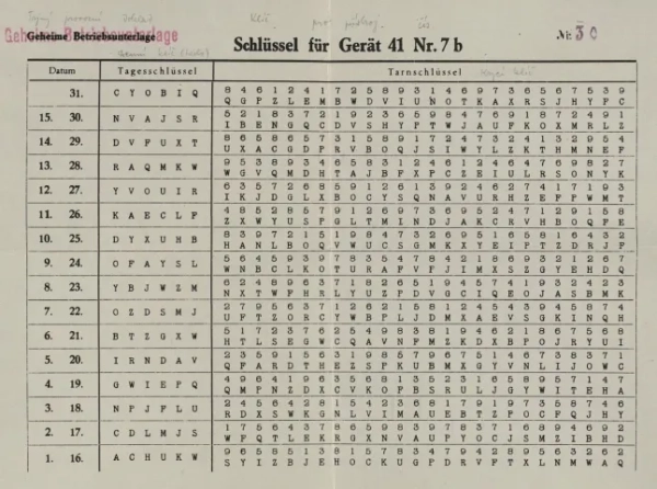 Архів також містив польовий посібник для операторів, нормативний акт під назвою Vorschrift Nr. 90, що пояснював, як генерувалися ключі шифрування, та щомісячні таблиці ключів, що використовувалися з 16 по 31 березня 1945 року.